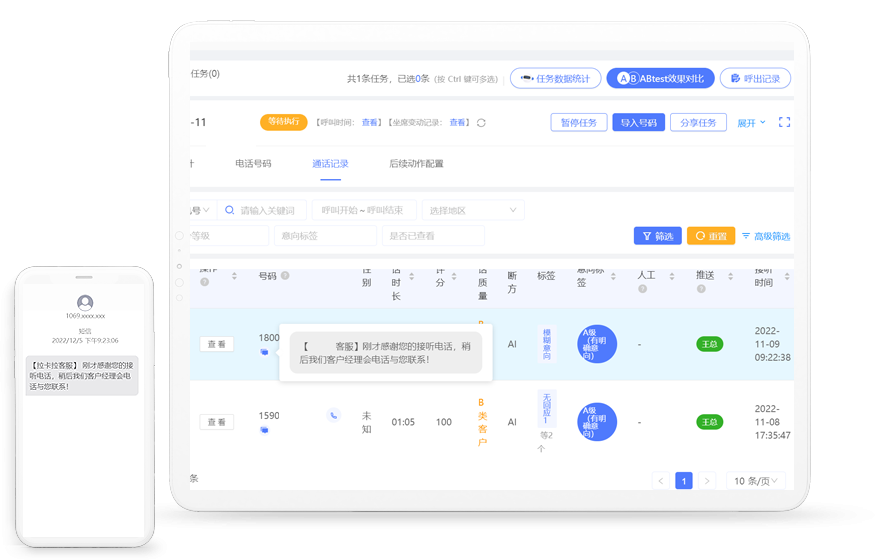 通过AI外呼及挂机短信相结合,提升销售与客户联系时的接通率与成交转化率