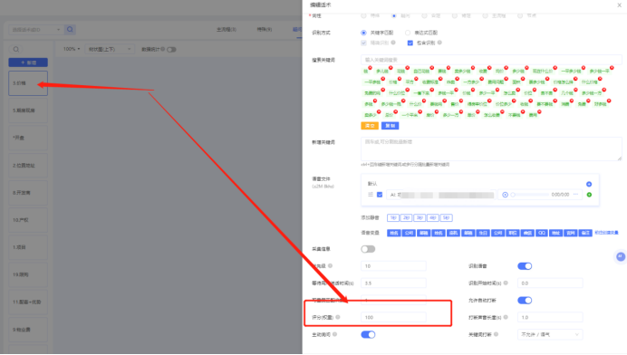 业务相关问题:例如,房产话术问,价格、位置等,每个问题得50分,一个档是50,所以50/100的这样加减方式。(全局的加分为了精准,话术中需要体现一下,可以在说辞后面写上50/100)